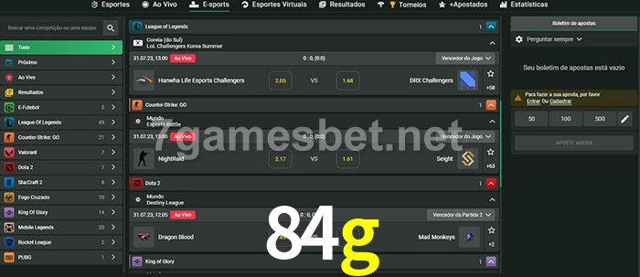 O 84g oferece uma grande seleção de opções de apostas em e-sports com probabilidades competitivas